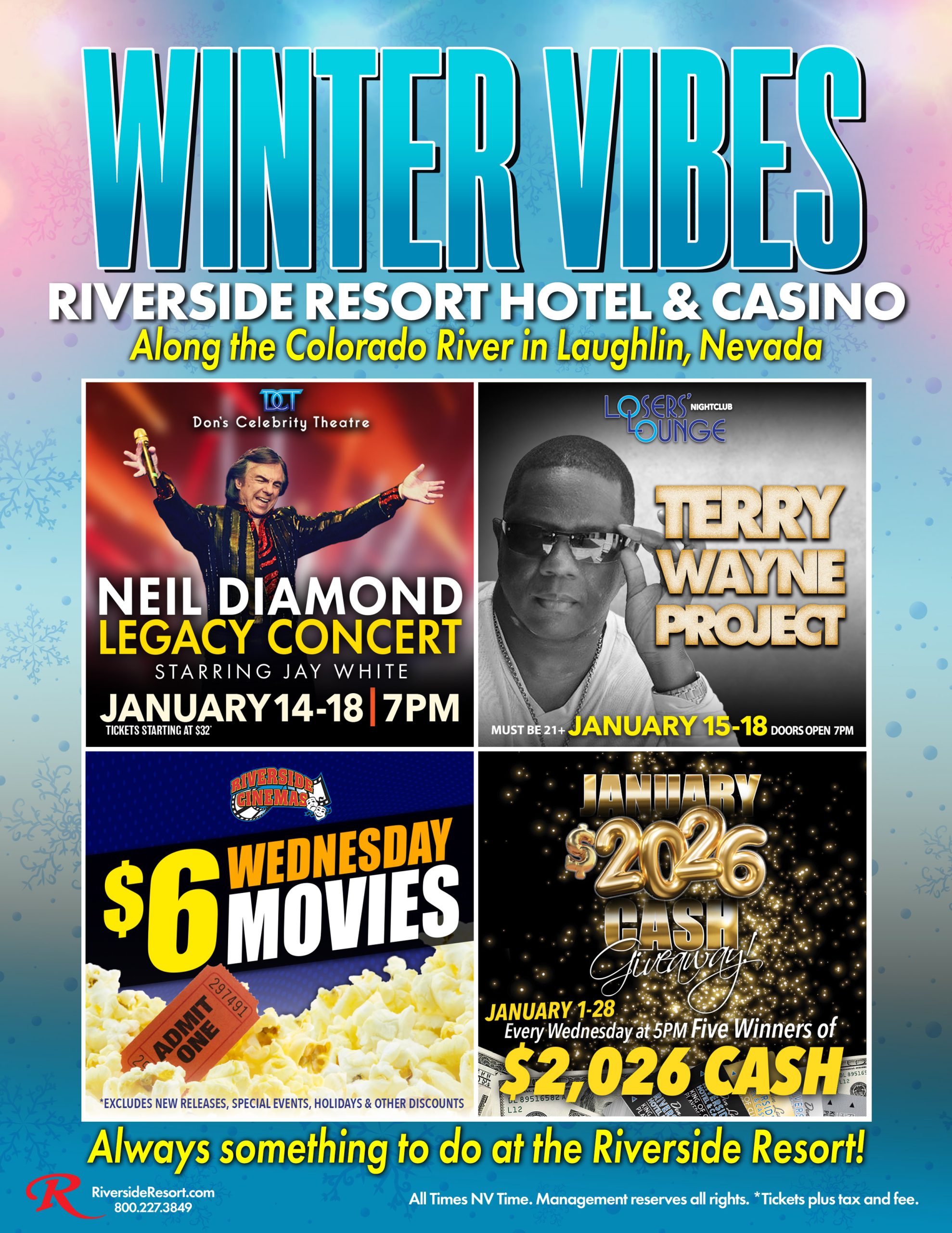 Experience endless entertainment at Don’s Celebrity Theatre, dance the night away at Losers’ Lounge or The Dance Club, catch a movie at Riverside Cinemas, bowl at Riverside Lanes, explore Don Laughlin’s Auto Museum, unwind by our two stunning pools, take a cruise on the USS Riverside, enjoy two Arcade Rooms, engage in Laser Tag, and so much more!