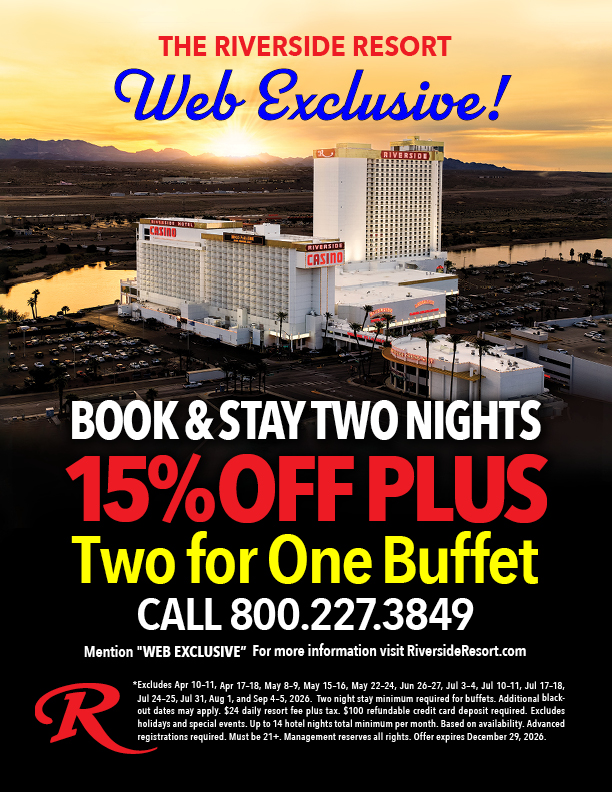 With more than 1350 beautiful rooms - most with a river view - the Riverside Resort Hotel & Casino is definitely the "Place to Be." Incidentally, each room boasts a refrigerator, coffee maker, basic WI-FI, and In-room Local & 1-800 Phone Calls.